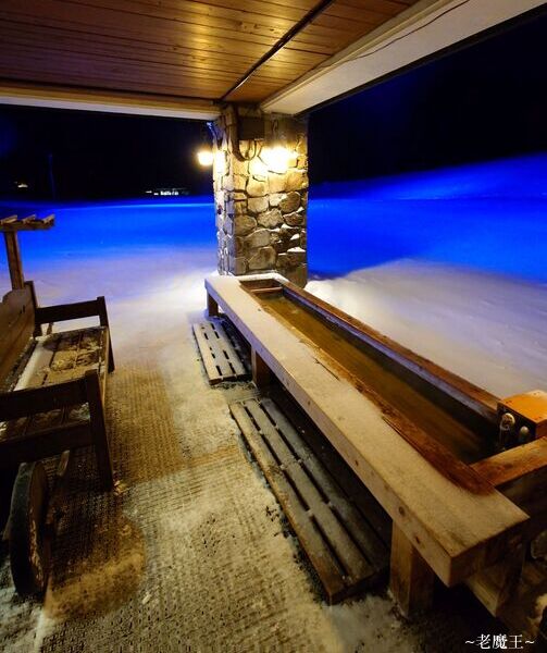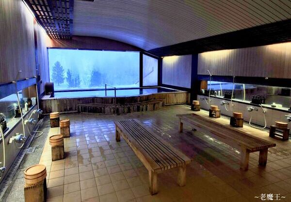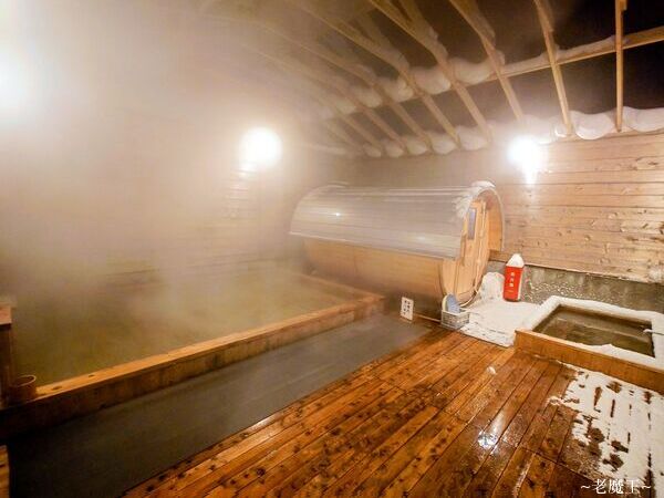 露天溫泉的設計很奇怪, 必須先走一段很滑溜的通道到戶外, 在雪中走大約 15 公尺後, 才得以進入有暖氣的房舍. 裡面有兩池, 一池在室內; 半露天的那一池, 必須走 13 階結冰且滑溜的木梯才能抵達.
