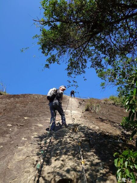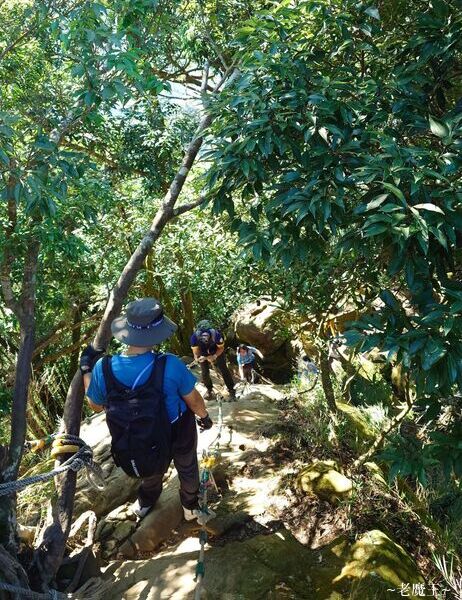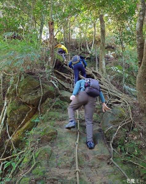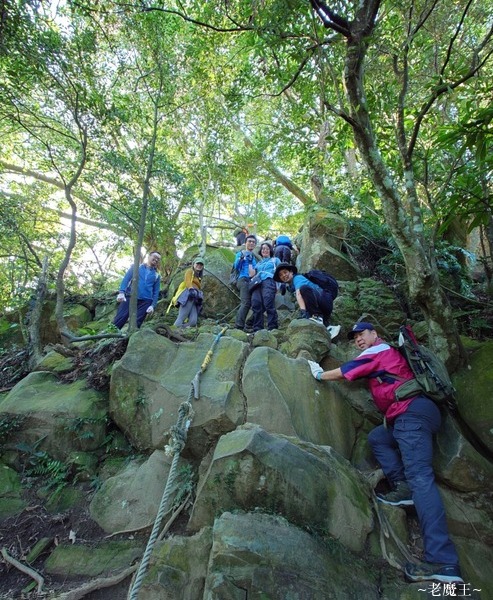 有一段幾乎垂直的岩壁, Henry 居然爬不上去!? 麗純, 土撥鼠, 峯駿, 穎為, 和健慶都輕鬆上去, 筱蓉勉強吃力爬上去, Elton 也沒問題, 但 Henry 爬了兩次, 都只能蹬上兩腳便再也沒力. 幸好旁邊有一條腰繞的山路, 雖然要多繞幾公尺, 但至少不用攀岩, 因此最後他從那邊繞上來, 跟我們會合. (早知道可以偷懶, 那我們幾個爬那麼累幹嘛?)