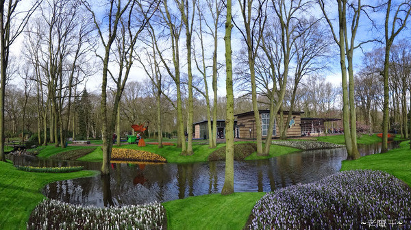 3 月 29 日星期二 前兩天不管走到哪兒, 到處都是人, 後來才知道 3/27 當天是復活節, 西方人連 3/28 也放假, 直到今天才終於要上班上課了! 因此我早上從旅館走到馬路上要搭輕軌電車時, 街上出現許多騎腳踏車上班的人. 荷蘭人真的很神奇, 可以把 "騎腳踏車" 蔚為風氣, 所以這兒的空氣算是相當乾淨; 這要是在台灣, 老早就滿街都是汽機車, 塵煙漫漫了! 我們搭車到 Leidseplein, 在一家餐廳吃過早餐後, 走路到 200 公尺遠的車站, 搭 197 號公車. 大約30 分鐘後, 坐到 Schiphol 機場. 在這兒另外花 10 歐元買公園專車的車票, 再坐 25 分鐘左右, 來到 Keukenhof garden (庫肯霍夫花園).