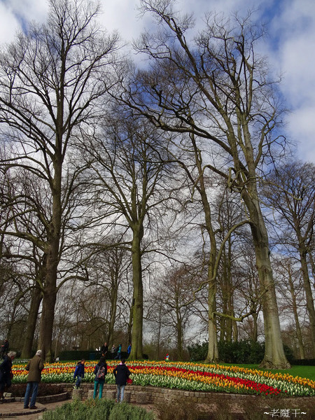 庫肯霍夫花園把每一種花卉取名字, 所以有的花圃叫做 "early harvest", 有的叫做 "flower record", 還有一個小花圃, 裡面的花都還沒開, 叫做 "China town"! 而名稱上, 則用比較小的字體寫在名牌最上方. 我一時不察, 把鬱金香和番紅花搞混. 回來看照片時, 才發現番紅花會寫 Crocus, 鬱金香則用縮寫 T 來指認. 這是鬱金香.