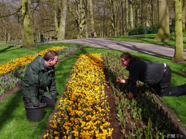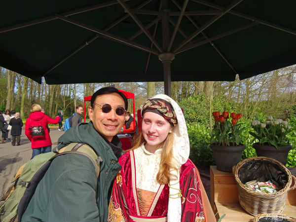 我走著走著, 發現一陣混亂中, 我居然已經走完整座公園了! 看看手錶, 花了 2 小時整而已. 我心想 "這裡不是號稱世界最大的花園嗎? 怎麼這麼快就走完了!?" 雖然我腳步是快了點, 但再對照園區地圖一次, 我真的參觀完一遍了!! 這庫肯霍夫花園, 論花卉總量, 可能是世界第一; 但論面積, 應該還不及加拿大的布查花園, 以及德國的梅瑙島. 我走回到大門口, 看看林醫師還沒出現, 便坐下來喝水, 吃花生, 休息一下. 此時遊客越來越多, 遊覽車一車一車地載人進來, 相信跟團的人應該是這時候才抵達. 一旁有兩位荷蘭姑娘, 穿著傳統服裝, 一面賣著鬱金香, 一面發送免費地圖, 我便過去找她們拍照.