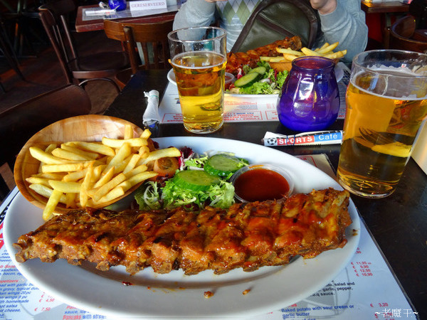 此時我們倆都有點兒餓了, 便決定去今天吃早餐的那一家餐廳; 因為, 今天早上看到他們的廣告--> "每人 11.9 歐元, 烤豬肋吃到飽"! 於是我們倆都點這烤豬肋.