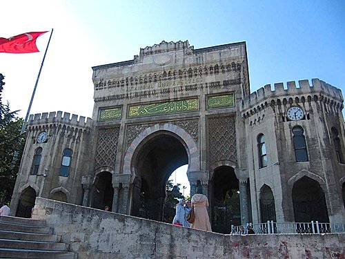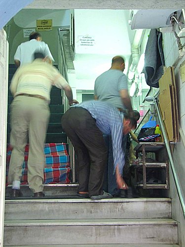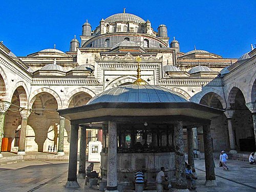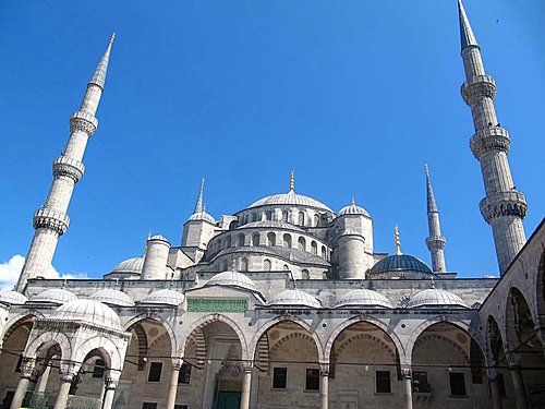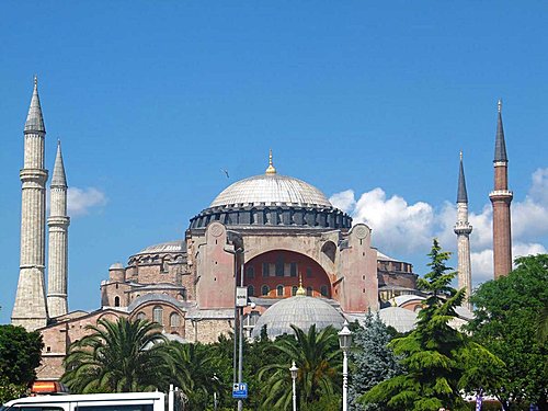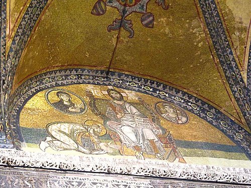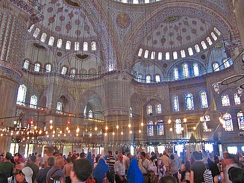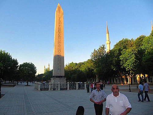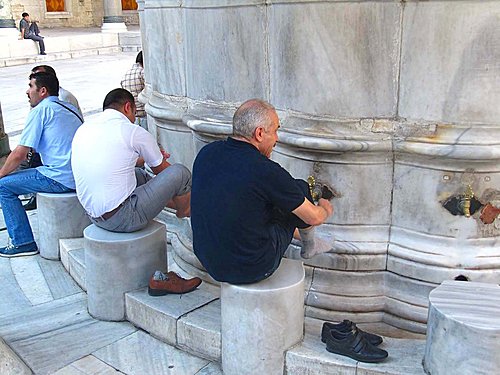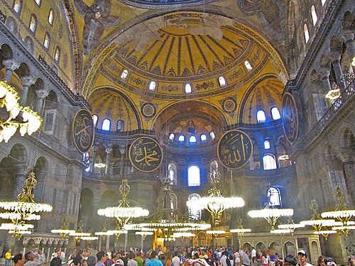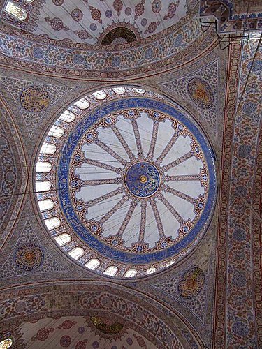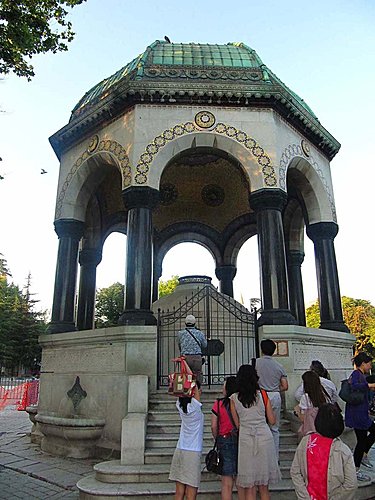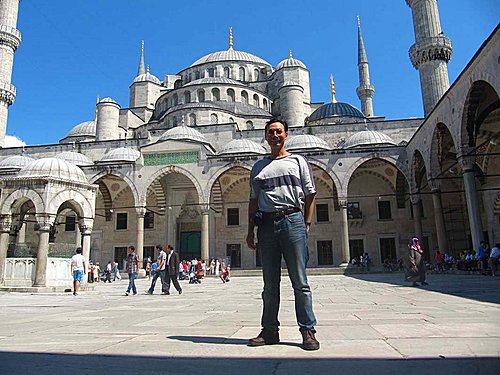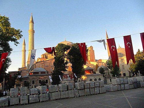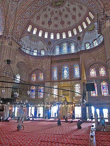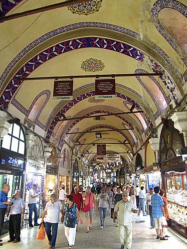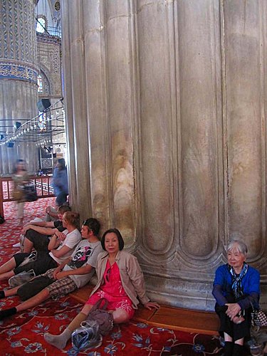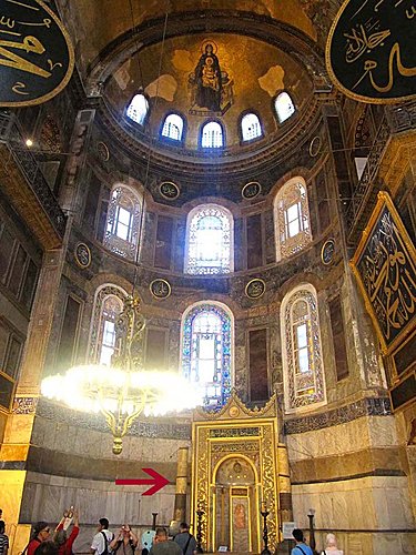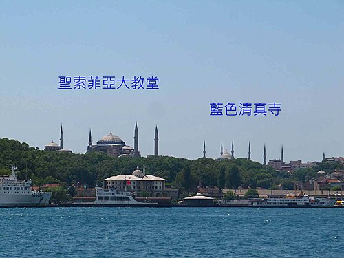 下了渡輪後, 我們到一家瀕臨馬爾馬拉海的餐廳吃午飯. 白領隊在 Bolu 的晚上狂拉肚子, 於是這一整天都虛軟無力; 我給他 buscopan 和 catilon, 但顯然只止住了他的腹瀉. 於是中午這一餐, 我還是建議他先不要吃東西, 補充一點水分就好. 我們下午的行程, 第一站來到 "藍色清真寺"! 這座清真寺叫做 "Sultanahmet mosque" (蘇丹那美清真寺), 是鄂圖曼土耳其帝國時期, 國王蘇丹專用的清真寺. 一般清真寺的宣禮塔為一根或兩根, 一根宣禮塔的清真寺, 是一般民眾使用; 有兩根宣禮塔的, 可能是官員或有點兒身份地位的人使用; (沒有 3 根的) 至於 4 根宣禮塔的清真寺, 通常是皇族或大官級在用. 現在早已沒有分的這麼清楚, 一般民眾都是到居家最近的清真寺祈禱, 不再刻意分階級了. 但這一座蘇丹專用的清真寺, 當初在蓋的時候, 為了要和其他清真寺區分, 不小心地蓋了 6 根宣禮塔, 倒成了它的特色! 不過, 來到這一區 "聯合國文化遺址", 不管從甚麼角度, 最多都只能看到 4 根宣禮塔. 要像中午搭乘渡輪, 從博斯普魯斯海峽看過去, 才可完整地看到 6 根宣禮塔. 這座清真寺建於 15 世紀 (鄂圖曼土耳其於西元 1453 年滅掉東羅馬帝國), 高 43 公尺, 天花板上共有六個圓頂. 我們進入前, 要先通過一個簡單的安檢 (簡單到我覺得根本沒有在檢查!); 接著脫掉鞋子, 穿上很像開刀房用的那種腳套. 女生的肩膀和小腿若是有露出來的, 還給你一塊披巾來遮住. 民眾買了門票後, 可以自由進出這裡; 但若要靠近 "mihrab", 對著麥加方向來膜拜的, 便得進入另一區. 我本來以為只要想膜拜的人都可以進去, 沒想到這一關就比較嚴格, 會有安全人員來確認你是不是回教徒, 才准予放行. 因此, 我就無法混進裡面那一區, 去摸摸那一道 mihrab 的金色門欄 (註: Mihrab 就是在清真寺裡, 永遠面向麥加方向的一間小室或凹壁). 這座清真寺, 天花板和牆壁上所用的, 主要是藍彩釉磁磚, 因此又被稱為 "藍色清真寺". 遊客非常多, 場地又很大, 於是一些走不動的人, 就自動形成這個 "貧民區"........... 走出清真寺, 大夥兒等在門口集合, 我利用空檔時間, 往另外一個方向走去, 原來這裡才是正門. 於是很快地照了幾張相, 再回去和大家會合, 往東方走向下一個景點. 從側門走出去, 穿過一座小公園, 就看到伊斯坦堡最有名的地標--> Ayasofya, 聖索菲亞大教堂. 但是, 從這角度看過去, 怎麼好像一個張開嘴在哭的小孩兒啊!? Abdu 在這兒租了導覽用的耳機給大家, 設定好頻道, 大家便可直接從耳機裡聽到他的介紹. 各個旅遊團設定不同的頻道, 便不會彼此干擾, 同時導遊在說明時, 也不需要講太大聲而干擾到其他遊客. 通過一段安檢大門後 (這回的安檢比較有樣子了, 但感覺上還是虛應一應故事而已), Abdu 介紹這座教堂兼清真寺. 原來這座教堂最早的建築紀錄並不完整, 但大約是在第四世紀, 由君士坦丁大帝下令建蓋. 後經兩次損毀又整修, 才成為今日的規模. 君士坦丁大帝晚年崇尚基督教, 因此這座建築原本是一座 "教堂". 在牆上的壁畫中, 還可看到君士坦丁大帝臣服於上帝的壁畫. 但是東羅馬帝國被滅了之後, 鄂圖曼土耳其帝國將之整建為清真寺 . 很神奇的是, 當年竟然沒有對原建築物做太多的破壞, 只是加蓋了宣禮塔, Mihrab, 以及把一些壁畫刮去, 並加了一些回教經文的圖騰. (回教拒絕對人物花鳥的崇尚, 所以清真寺裡是不能有雕像或畫像, 只能有文字和圖案) 這座教堂能被保留, 真的是一大奇蹟, 畢竟在西方世界裡, 不同的宗教, 往往就代表一場戰爭. 勝利者會保存失敗者的宗教建築, 我覺得這表示了一定的包容力! 像印度, 經歷印度教, 回教, 直到蒙兀兒時期, 每一個階段, 前者的教堂都會被摧毀! Abdu 介紹到這兒, 說進入這教堂有三座門, 中間是皇帝走的, 兩邊是官員走的, 問大家想從哪個門進入? 哈, 在這種時代, 當然二話不說, 通通從正中間的門進入! 這座教堂高達 54 公尺, 是當年全世界最大的教堂. Abdu 和白領隊一直強調 "今非昔比", 因為聖索菲亞大教堂比藍色清真寺早了一千多年, 但無論建築規模, 通風設計和外觀, 前者都勝過後者. 教堂裡的 Mihrab, 為了要朝向麥加的方向, 所以和正殿的正中門有個偏差. 當年鄂圖曼土耳其帝國的蘇丹真是佛心來著, 只把 Mihrab 建造個偏一點, 並沒有去破壞原教堂的正殿! 正殿的圓頂, 可看到戴著光環的聖母瑪利亞抱著耶穌, 侍立兩旁的, 則是阿拉伯文的可蘭經圖騰. 這種宗教共榮的場所, 還真只有土耳其這麼可愛的國家做得到! 我們依照指示, 走到二樓參觀其他壁畫. 從二樓看下來, 一圈一圈的燈, 好像小蓮花座一樣! 如果每朵蓮花上再放個佛祖像, 我想, 世界就會因此而大同了吧, 哈! 連續參觀完兩座西洋廟, Abdu 帶我們到伊斯坦堡最受歡迎的市集--> Grand Bazaar (大市集). 聽說裡面阡陌交通, 縱橫來去, 導遊們怕我們會迷路, 特地帶我們從一號門進入 (gate 1), 並要大家萬一迷路了, 就拿出此門的相片問當地人, 以準時回來集合! 說明完畢, 大家解散! 老實說, 這種逛街的行程, 對我而言是最無聊的. 尤其面對五花八門的小工藝品或商品, 我根本不知要看些甚麼. 於是, 按照我的習慣, 先很快地穿過幾條街, 走到外圍去. 果然, 走出來後, 覺得好多了, 看到賣水的小孩子 (趕快跟他買一瓶水, 因為好渴喔); 看到跟我做鬼臉, 卻不知道想幹甚麼的青少年 (我覺得他們好像只是鬧鬧觀光客的樣