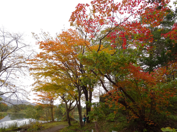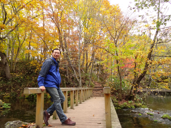大夥兒在這兒觀賞十來分鐘, 這才在約定時間回到車上. 沒想到有一對情侶遲遲沒出現, 函館山的管理員一直對著我們的遊覽車逼迫, 要我們離開. 原來這兒有規定, 各種車輛都只能停留 30 分鐘, 以避免嚴重塞車. 導遊趕忙下車去找那一對情侶, 才知他們記錯時間. 幸好這一區很小, 所以容易找到人. 大夥兒回到飯店, 先去泡個湯, 然後在暖暖的和式房中, 沉沉睡去. 10 月 22 日星期二 早上起床, 依舊是陰天. 不過我覺得很滿意了, 因為先前看氣象預報, 這幾天應該是要下雨的. 有個國樂社的學妹上禮拜來, 竟然遇到驟雪 (當時有一道颱風帶了大量水氣到日本, 剛好北海道有一波寒流經過, 竟導致下雪!). 學妹的賞楓之旅, 變成踏雪之行, 我看她在臉書上 PO 的照片, 楓葉都被遮蓋在雪下, 只見她一臉的無奈....... 今天的第一個行程, 來到函館的大,小沼國定公園. 這兒是由三座火山湖, 以及湖上總共 126 座大小不等的島嶼形成的國家公園. 在此深秋楓紅時刻, 顯得浪漫而舒適.