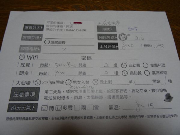 我跟團旅行, 從來沒有特別介紹過導遊. 但這次的導遊很特別, 他居然每天把房號, 用餐時間, 集合時間等等細節, 依各人的名字來印製.