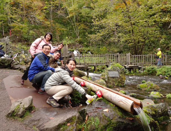 後來聽導遊說這兒的 "墨汁冰淇淋" 很有名, 可惜他說這句話的時候, 車子已經開動, 所以沒有人買到這墨汁冰淇淋! 途中經過這兒的一座活火山 "駒之岳", 但此時雲層厚重, 導遊也沒讓我們下車拍照. 下一站來到名水公園. 這兒的水質聽說不但潔淨, 還富含礦物質, 是可以直接生飲的天然湧泉; 因此, 此地高居日本十大名水之一. 導遊還說, 事實上, 這兒的水質絕對有在日本前三名! 因著這水質而形成的名水公園, 典雅秀麗, 令人流連忘返!