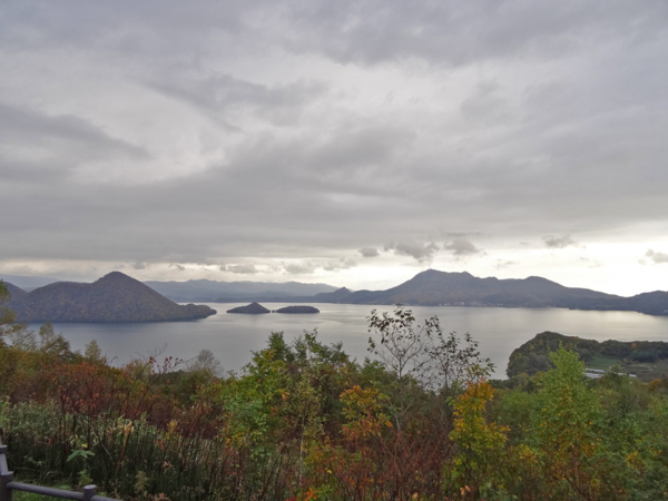 我們只有開車經過, 利用一個轉彎, 我趕緊拍下這一張照片. 以山形和積雪而言, 還真的很像富士山. 接著來到洞爺湖. 我 8 年前來這兒, 晚上住在湖畔的旅館, 可以在房間裡和好友們一邊喝酒聊天, 一邊觀賞湖上的煙火秀. 但這一趟沒有住在洞爺湖邊, 只來到一處觀景台, 讓大家拍照買紀念品.