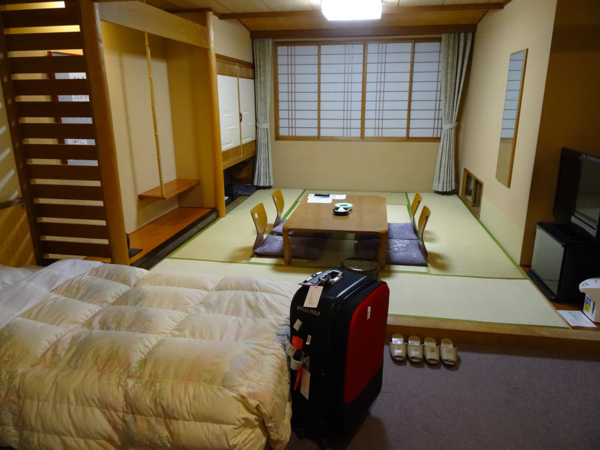 由於時間晚了 , 導遊決定把熊牧場挪到明天早上. 我們便先去今晚的飯店--> 名水亭大飯店. 這一家溫泉飯店相當高級, 自助式的晚餐除了帝王蟹吃到飽之外, 還有無限供應的現煎和牛牛排, 大夥兒都吃地很過癮. 溫泉的部分, 除了室內的溫泉和泳池之外, 則有一座寬廣的戶外池, 旁邊是一道溪流, 可以享受徜徉在大自然的感覺. 整體而言, 這一家溫泉旅館是我覺得四個晚上中最棒的.