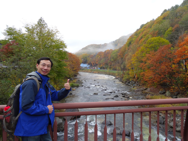 我和小黑, 麗君三人散步到川邊拍了幾張照, 這才回飯店吃早餐. 日本人很準時, 說 7 點才供應早餐就是 7 點, 即使門口已經大排長龍, 工作人員硬是堅持到 7 點正, 才開放大家進餐廳. 用過早餐後, 還有一些時間, 我們幾個走到橋邊拍照. 這時朝陽逐漸從雲層後露出臉來, 溪邊的林木有一股難以言喻的淒美脫俗. 北海道的秋天, 真的是煙霏雲歛, 山川寂寥啊!
