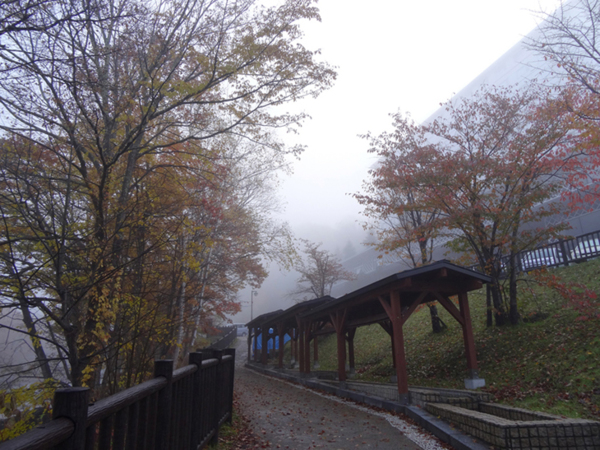 10 月 23 日星期三 早上起床, 先到樓下泡溫泉, 接著到飯店四周走走. 昨夜下了一點雨, 地上濕漉漉的. 清晨的長流川畔小徑, 在晨霧中顯得迷離朦朧, 有一種清新卻神秘的美感.