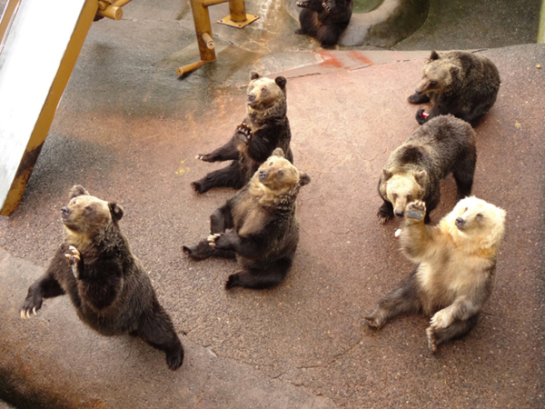 集合完畢, 大夥兒出發前往位於昭和新山旁的熊牧場. 這兒我以前來過, 所以推薦燕嘉要買蘋果進去, 因為, 來這兒就是要幫商家餵食他們飼養的熊. 這裡的熊被遊客嬌寵到變地很好笑, 居然會做出各種乞討的動作, 請求遊客把蘋果丟給牠們吃. 只見有些熊會向遊客招手, 有些熊會故作可愛地仰躺在地上, 有些甚至會做出乞討的動作!