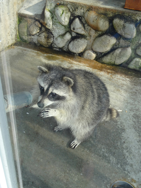 另兩處獸欄裡的浣熊則現實多了, 只會坐在一旁, 等遊客把餅乾從餵食孔中扔下去, 並不會做出乞求和歡喜的動作. 看樣子, 兩種動物的智力還是有一定的差距. 而且浣熊的齒力似乎不夠強, 我看牠們撿起餅乾後, 咬了幾下, 似乎咬不動, 還得拿到水邊搓搓洗洗, 把餅乾略為泡軟了, 才開始吃.