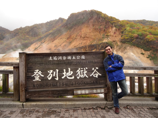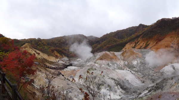 雖然這種餵食, 對野生動物實在是不好, 但日本人藉由這種噱頭來賺錢, 各地來的遊客們也樂在其中, 我看那些熊好像也玩得很高興. 唉, 看樣子, 只有動保人士會不愉快吧! 下一站來到登別地獄谷. 這裡是北海道第一大溫泉區, 由青面紅面二鬼守護著. 據說不同的火山口, 附近的泉質還不一樣, 全區多達 11 種不同礦物質的泉水源頭. 一般遊客來走的, 是高達 80 度 C 的鐵泉.底下的火山熔岩依舊蠢蠢欲動, 所以各處山頭仍然白煙四起, 其中還是以硫磺味的溫泉最引人注意.