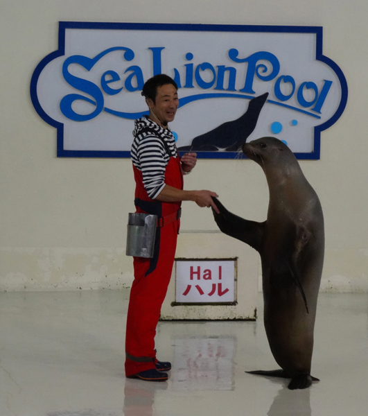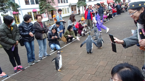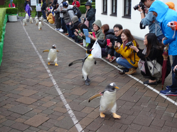 據說這一家海洋公園本來經營不善, 差點兒要關門; 但有一天, 意外發現他們的企鵝會跟在管理員的後面一起散步, 於是他們便開發了這 "企鵝遊行秀". 每天兩個時間, 管理員帶著企鵝開始走到廣場上, 讓遊客圍在遊行步道兩旁觀賞. 想當然耳, 結果一炮而紅, 尤其台灣和大陸的觀光客最賞臉, 讓這座海洋公園幾乎成了北海道旅遊團的必訪景點. 這些企鵝走路搖搖擺擺的樣子, 真的很可愛, 一走出來, 立刻吸引所有目光.