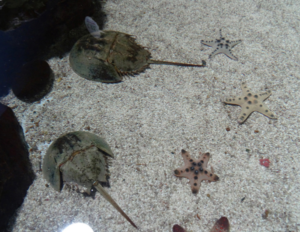 海洋館裡面的展示相當豐富, 我們先搭手扶梯穿過擁有鯊魚群和魟魚群的海底隧道來到三樓, 再沿著指示方向逐一參觀. 一開始出場的, 是很像加州聖地牙哥海洋公園般, 可以用手觸摸小動物, 包括海星, 海參, 角鯊, 小魟魚和小鱟魚. 我第一次摸到魟魚, 好軟好好摸; 角鯊則皮粗粗的, 鱟魚不用說, 背殼非常硬.我有點想惡作劇地把鱟魚翻過來, 看看牠怎麼翻回身來; 可是, 理智終究戰勝邪念, 還是摸一下牠的背就好了.