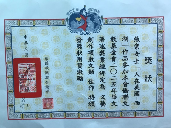 台灣僑聯總會的海外華文著述獎參赛者來自世界各地,人數眾多,而録取名额極為有限。例如文兿創作類中,散文只取11名,小說6名,詩歌5名。所以能夠獲奬,尤其同時獲散、詩双料奬,得之不易,一如当年我以平平成績學子,居然以第一名成績考上台灣大學商學系國貿組,當年父母引以為傲,如今父母已去天國,相信他們在天堂知道我老年獲奬消息也會以我為榮吧!