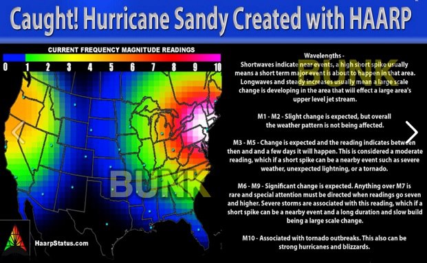 有鑑於此,由於「完美風暴」桑迪吹襲月份為10尾,剛好是2012年美國大選11月的前一個多星期出現。這場毀滅性的自然風暴是利用五角大樓資助的HAARP(高頻有源極光研究項目)的氣象武器一手炮製出來的「實驗結果」,旨在製造選舉期間的混亂,利用混亂在選舉中搞鬼是眾週所知的政府技倆。