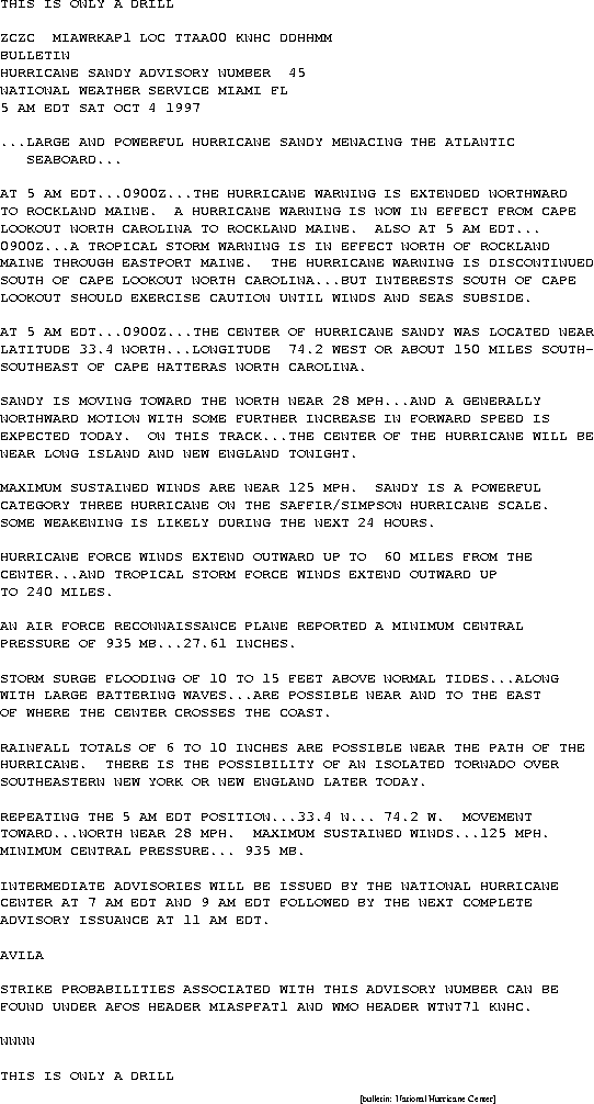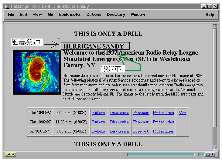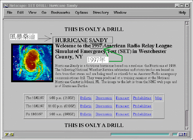 桑迪的吹襲路線更加詭異。她除了不吹襲美國南部而是吹襲美國東部外,她的吹襲路線卻無獨有偶地與1997年,美國政府一個模擬風暴吹襲災難應變計劃有關,該計劃名為:「American Radio Relay League Simulated Emergency Test」有著驚人的相同之處。 (如果你有足夠的警覺意識到,你會發現在美國所有的「假旗/偽新聞」事件之前,總有某種相關的「演習」; 如在911雙塔前事件前(同日?)的空軍'演習',其中演習的內容還包括'五角大樓被侵襲',導致911第一時間發生時,許多單位均被告知「這是演習」, 巧合嗎? --1d)