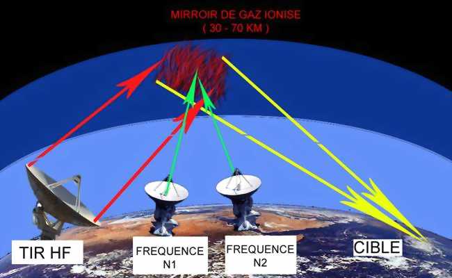 HAARP 用載波(其頻率範圍是2.8~10兆赫)將其要發射的頻率(低頻或高頻)進行調製,然後發射至臭氧層。如果HAARP的頻率能引起極 光電噴流諧振,那麼就可以把極光電噴流變成一個虛擬天線。使之輻射出具有極強能量的電磁波,其高頻可到幾百萬赫,低頻可低至0~1000赫。