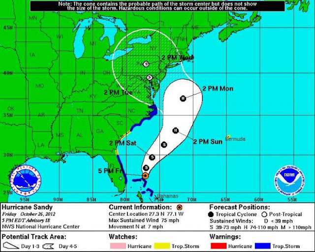 按照美國國家颶風研究中心的信息,「桑迪」向左急轉彎後在新澤西州登陸,幾乎是頭一次。一般颶風會先向北行,然後左轉,進入海洋水域。「桑迪」異常轉向的原因可能是受到以格陵蘭島為中心的高壓系統阻攔。10月20日一個熱帶擾動於加勒比海海域形成,10月22日國家颶風中心發佈熱帶氣旋形成警報,稍晚升格為一熱帶風暴,並命名為「桑迪」(Sandy)。 隨後路徑朝北增強為一級颶風10月25日凌晨登陸牙買加,出海後再度增強為二級颶風(最大風速175km/小時)不久後再從古巴東南海岸登陸,出海後減弱為一級颶風,在10月26日凌晨穿過巴哈馬,目前總計185人死亡,10月27日凌晨減弱為熱帶風暴,28日再度增強為一級颶風,路徑往美國東海岸前進。 桑迪的詭異之處