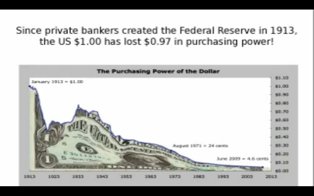自從私人銀行家在1913年建立聯邦儲備體系以來,1美元已經喪失了0.97美元的購買力,購買一件物品在1913年要花100美元,在2011年要花2230美元, 價格上漲2130%。
