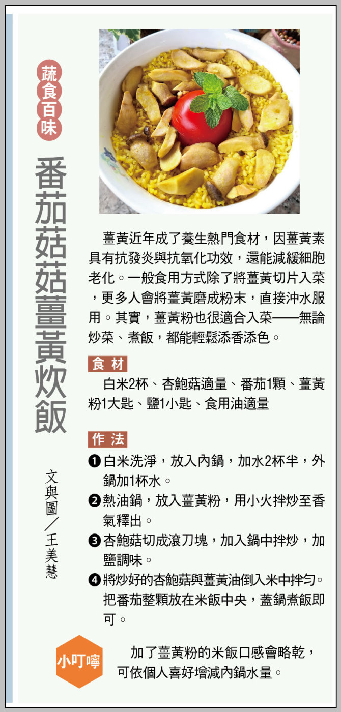文。圖/王美慧 薑黃近年成了養生熱門食材,因薑黃素具有抗發炎與抗氧化功效,還能減緩細胞老化。一般食用方式除了將薑黃切片入菜,更多人會將薑黃磨成粉末,直接沖水服用。其實,薑黃粉也很適合入菜——無論炒菜、煮飯,都能輕鬆添香添色。 * 本文刊登於(人間福報)蔬食食譜版 2025/10/25