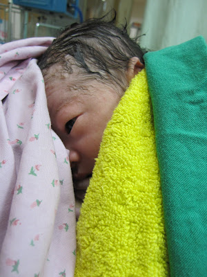 當初晨晨的生產過程,或許是老婆產程順利,所以一切都很「按部就班」,規律陣痛、落紅、破水、在拉枚茲呼吸法的引導下,從4CM一路開到8CM,然後上產 台、呼吸、用力、一直到順產~ 過程中很痛、很辛苦、很累,但是一切似乎都在掌握之中,讓大家都好安心~ 而妹妹的生產過程似乎就不是那麼輕鬆! 這一次老婆子宮頸壁似乎軟化速度稍慢一些,才開了五公分! 但是陣痛程度已經讓老婆無法專注於呼吸法了!期 間護理師來來回回檢查了數次,等開超過五公分後,子宮頸壁也有明顯軟化,長庚的護理師居然開始助產了。原本我以為只是協助產道擴增速率加快,但卻要老婆開 始用生產姿勢憋氣用力!這方式與當初我們在台安開八公分才進產房用力生產有明顯差異!雖然不明其意,但也只能配合護理師行事。只見護理師用手指「協助」老 婆讓產道可以擴張得更大、更快,每一次的憋氣、用力,都可以看到有羊水、有血液汩汩地流出。有時候老婆疼痛難忍,憋不住氣,更難以自抑地痛嚎著!一旁陪 伴、等待的我,只能緊握老婆的手,給予加油打氣,剩下的,或許真的只能看看上天的旨意~ 原本以為是只要看到胎兒頭髮就進產房由醫師接手,不過過程有點出乎大家意料之外。從五公分、將近六公分開始用力,才不到半小時的時間,老婆痛呼大叫快不行了!原本護理師要求老婆盡量保持張開的姿勢,卻改叫老婆別用力、深呼吸就好,而且還強行把老婆雙腿併攏!幾位護理師趕緊將老婆推進產房,另外走過來一位叫我趕緊收拾行李,換裝準備進產房陪伴。我換完裝後在產房門口焦急地等待引導。秒針每一格的移動宛如一世紀那麼久,焦急的心跳似乎比跑完奧運百米競速還要快!惶惶然,滿腦子都只有老婆剛剛難以自抑的痛苦模樣,這是怎麼一回事? 好不容易產房的門打開了,透出的光影,彷彿天堂撒落的聖光一般!門口招手的護理師就像是天使一樣,「把拔快點進來」就好像是聖音一樣,我加緊腳步往裡面趕,並依指示坐在老婆左肩旁的板凳上,醫師帶著醫療團隊似乎不停忙著什麼,我手上拿著相機,卻不知道該不該ON起來?這…跟當初晨晨生產過程真的完全不一樣!這是怎麼一回事? 屁股沾上板凳似乎才三秒鐘不到,聽到老婆又痛呼起來,我趕緊上前抓住她的手,正想陪伴她循以前拉枚茲呼吸法來讓妹妹順產。這才一瞬間,眼睛餘光瞄向醫師, 耳邊老婆似乎因為陣痛還叫著,但怎覺得聲音有些縹渺;被緊抓的虎口好像有被老婆指甲嵌入的疼痛,但怎覺得痛的好像不是我;醫師手上那一坨紫紫紅紅的小肉 球,好像一副小人樣,護理師手上的吸取器,正伸進她嘴中一吸一吸地…那…就是我家的小龍女嗎? 恍惚間,冰冷的空間似乎開了一道門,感覺好像整個人被抽空了一樣~ 當妹妹哇的哭泣聲傳來時,我的靈魂才倏地又鑽回體內,暖意從那道門散發出來,再次溫暖我的心臟與四肢,我知道,生門為老婆跟妹妹而開啟了!緊緊擁抱著老婆說:那是妹妹的哭聲!那是妹妹的哭聲!