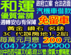 台中當舖/台中借款/台中借錢/台中借貸/汽車、機車借款免留車/和運當舖04-22919900 |