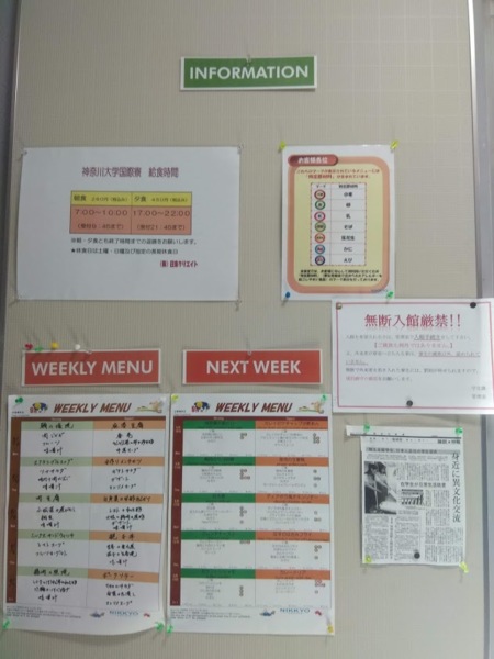 一樓也有食堂,每個禮拜會公布當週的菜單(下圖),供應早餐和晚餐,想吃的話要在三前預訂,錢會從住宿費扣。早餐一餐要280日幣(90元左右),晚餐450日幣(150元左右),比日本外食便宜很多!份量都超級大,訂早餐可以吃到很飽,因為飯,湯和茶可以自己續碗,可以吃到很飽然後就不太需要吃午餐了的程度