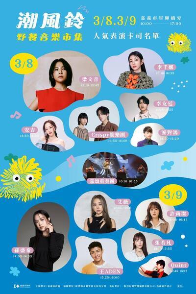 「潮風鈴•野餐音樂市集」3/8日起登場 知名歌手、樂團輪番登台 邀請你聽花開的聲音,歡迎來嘉義賞花囉 !![]() 黃金級春日美景,潮風鈴 •野餐音樂市集開張! 春天限定! 黃金級美景來了! 3月8日-3月9日 勇媽市長黃敏惠 邀你來嘉義八掌溪右岸堤防賞花 滿片金黃色花海配上超強音樂陣容輪番開唱,還有50+特色市集,吃喝玩樂一次滿足! #超強音樂陣容 孫盛希、李千娜、艾薇、梁文音、Crispy脆樂團、李友廷、張若凡、王 ADEN、安吉、許莉潔、嘉頌重奏團等超強卡司輪番登場! #50特色市集 手作、選物、美食,一次逛足 #氣球及魔術表演 視覺驚喜不間斷 #環保行動 帶舊電池來,換野餐墊或野餐籃(限量) 地點|八掌溪右岸堤防(吳鳳南路547巷旁) 時間|3/8(六)- 3/9(日)10:00-17:00 停車資訊|輔仁中學、立仁高中 春天的正確打開方式 = 野餐 + 花海 + 音樂! 揪上你的好友、情人、家人,來這裡享受最chill的春日假期! ![]()