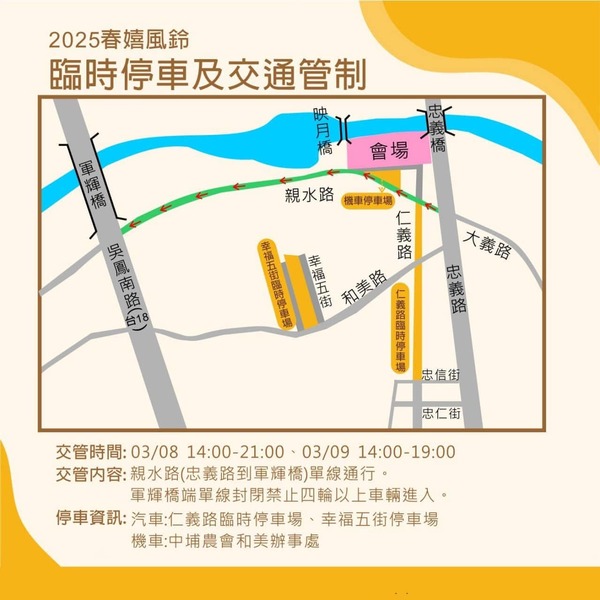 嘉義市政府將於3月8日及9日(六、日)二天,在八掌溪右岸堤防舉辦「潮風鈴•野餐音樂市集」活動,結合音樂、藝術、在地特色市集與環保元素,嘉義市市長黃敏惠邀請民眾在浪漫的花季中,享受一場視覺與聽覺的雙重饗宴。 嘉義市黃敏惠市長表示,八掌溪右岸堤防(吳鳳南路547巷旁)近一公里長的黃花風鈴木,每年三月初至中旬,金黃色的花朵交織成一片壯麗花海,吸引無數民眾前來賞花。今(114)年嘉義市政府特別結合花季舉辦「潮風鈴•野餐音樂市集」,期待透過這場音樂、美食、美景交織下的花季活動,讓更多人欣賞嘉義市的自然之美,也為城市注入更多觀光活力。 嘉義市政府觀光新聞處張婉芬處長表示,活動期間除邀請嘉義市在地嘉頌重奏團外,並邀請多位知名歌手與樂團輪番登台,為現場帶來精采的音樂演出,包括以獨特的嗓音與創作實力聞名的金曲歌后孫盛希、實力派唱將李千娜、新生代人氣歌手艾薇、治癒系歌手梁文音,還有以輕快旋律與細膩編曲著稱的Crispy脆樂團及創作才子李友廷,還有催淚歌姬之稱張若凡、饒舌才子王ADEN、甜美系歌手安吉以及擁有溫暖嗓音的許莉潔等,還有派對鴿跟Quint精彩氣球及魔術表演,他們將用音樂及表演為活動增添更多浪漫色彩。 張婉芬處長進一步分享,除了音樂表演外,活動現場還規劃市集,包括結合嘉市潮選店的商家攤位及在地文創商品,沿著步道,更設置了多處打卡亮點,供遊客拍照留念。活動還融入環保理念,推出「舊電池兌換野餐墊或野餐籃」的活動,鼓勵民眾參與環保行動,讓賞花之旅更具意義。 「潮風鈴•野餐音樂市集」將於3月8日及9日(六、日)二天,活動期間從上午10時至下午5時帶來連續不斷的音樂演出與互動表演,還有氣球與魔術秀為活動增添趣味,無論是親子家庭、年輕人還是情侶,都能在這場活動中找到屬於自己的樂趣。開車前來的民眾可依導引於輔仁中學或立仁高中停車,詳細活動資訊請至嘉義市觀光旅遊網( https://pse.is/77sank )查詢。 ![]() ![]() 潮風鈴.野餐音樂市集-大咖歌手雲集 ![]() 黃敏惠市長與6位市府同仁組成的「花仙子」代言人 ![]() 黃花風鈴木盛放時 總吸引大批遊客前來(圖為示意圖) (6) ![]() 黃花風鈴木盛放時 總吸引大批遊客前來(圖為示意圖) (5) ![]() ![]() 八掌溪右岸 三月的微風輕輕吹拂,八掌溪畔的風鈴木悄然綻放,一場屬於春天的美好時光即將展開——「潮風鈴•野餐音樂市集」將於3月8日、9日閃耀登場! 除了美麗的黃金花海,現場還有金曲歌后孫盛希、實力派唱將李千娜、溫暖嗓音的許莉潔、甜美系歌手安吉,以及Crispy脆樂團、創作才子李友廷等音樂人輪番登台,搭配溫馨有趣的市集、表演,為這場盛會增添更多驚喜!這是一場視覺與聽覺的浪漫饗宴。在這片黃金花海之中,邀你約親友一起、帶上野餐墊,享受這場春日浪漫嘉年華。 Hello!給約嗎?想約你來嘉義賞花野餐。潮風鈴響起,春日音樂野餐派對即將登場! 活動資訊 日期:3月8日(六)、3月9日(日) 時間:上午10:00 - 下午17:00 地點:八掌溪右岸堤防(輔仁中學、立仁高中周邊可停車) ![]() 潮風鈴.野餐音樂市集-停車位置 「潮風鈴•野餐音樂市集」3/8日起登場 知名歌手、樂團輪番登台 邀請你聽花開的聲音 2025 #春嬉風鈴(八掌溪南岸) 青春無敵大卡司 第一名的男團、女團,最熱情的應援啦啦隊都來了。最紅的、最有人氣的都在中埔大集合了 03/08 (六) 帕拉斯樂團、抒天弗樂團 賴慧如、許志豪、樂天女孩 AKB48TeamTP、Ozone 03/09 (日) 水管阿民、杜忻恬、李子森 吳申梅、中信兄弟啦啦隊 ------------------------------ 【春嬉風鈴】2025絢麗奪目 日期:2025/03/08~03/09 地點:中埔鄉忠義橋下 (八掌溪南岸) 絢麗百花開|綺麗百市集 絢爛煙火秀|炫光森林BAR #炫耀星光演唱會 ![]() ![]() ![]() ![]() ![]() ![]() ![]() ![]() ![]() 嘉義 花開燦爛 行道樹演繹春色 春天不只是櫻花的季節,賞花也不一定要舟車勞頓,奔往人擠人的風景名勝區,在城市裡轉悠,也能遇見花開燦欄的春色。3月的嘉義市,黃花風鈴木、羊蹄甲、火焰木與煙火樹等行道樹,一一開花,在市區就能欣賞五彩繽紛的季節詩篇。 ![]() 行道樹不僅發揮綠美化功能,改寫城市景觀,也豐富了城市裡的四季風景,3月開花的路樹很多,黃花風鈴木(也稱黃金風鈴木)、羊蹄甲、煙火樹等都很經典,為了捕捉黃花風鈴木豔麗的風采,我來到了嘉義市,依循花的路線,拼貼這個城市的尋幽地圖。 ![]() 黃花風鈴木是巴西國花,花色是比向日葵還耀眼的金黃,花形有如高懸樹梢的風鈴,隨風輕輕搖蕩,開花時樹上的葉子幾乎落盡,只留下滿樹的黃,生命如櫻花般短暫,從花開到花謝只有10來天,也跟櫻花一樣有落英繽紛的姿態,花樹下常可見落花鋪砌的黃色織毯,迷人風韻一點兒也不輸櫻花呢! 溪岸堤道 花開綿延。 ![]() 嘉義市有多條路以黃花風鈴木做行道樹,又以世賢路1段、自由路和八掌溪兩岸堤防道最多,最美的就屬八掌溪堤防道了,不但樹種得多、種得密,而且防波堤的高低落差,縮短了花與視覺的距離,加上這兒的花開得較早,枝頭上已掛滿一朵朵風華正茂的黃花,堤防上也落滿了花,滿滿的黃似乎無止盡地往堤防盡頭延伸,煞是美麗。不過,再次提醒您,花期很短,賞花可得加快腳步。 八掌溪畔除了黃花風鈴木外,還有一座色彩紅豔的行嘉吊橋,橋下的溪床上,芳草淒淒、密密麻麻的咸豐草迎風搖曳,白花襯綠草,加上有徐志摩筆下的數大之美,也