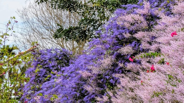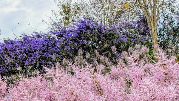 2025中寮花季正式展開,美麗的麝香木粉紅花毯已有八成綻放,園區內還有錫葉藤、九重葛、山櫻花和黃花風鈴木也幾乎都在這個時間段同時接力綻放著,接下來就跟著13一起開啟一段最夢幻的粉紅浪潮賞花之旅囉! 腳步循著園區內的小徑漫步,左右兩旁都是高過於頭且已經盛綻的粉紅麝香木,不遠處還有一棵山櫻,好夢幻的景色啊,才入園就讓人驚豔的想尖叫了。