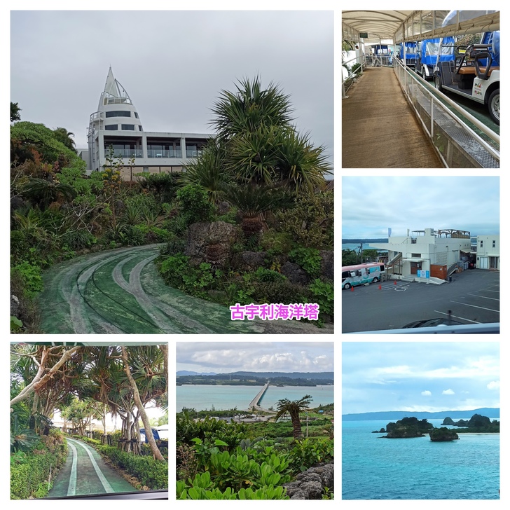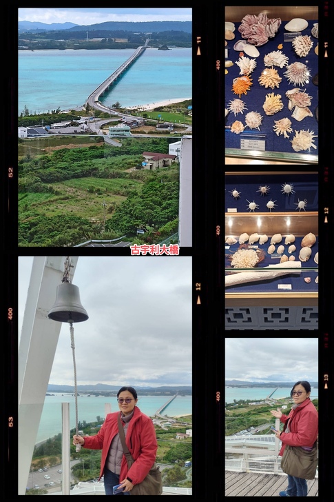 路上經過有名的蝦蝦飯,因時間尚早而未營業,只能放棄品嚐機會,直接來到古宇利海洋塔,先坐高爾夫球車移動,沿途可看到熱帶植物林立車道兩旁,約莫五至十分鐘抵達古宇利海洋塔,一樓是介紹古宇利島的歷史資料,還有各式貝類的展示區;二樓三樓是室內展望區(有電梯),而頂樓需要走樓梯上去,頂樓有設置一個鐘,可以敲響鐘聲與拍照留念,站在至高處環顧四周景象,真的是美的讓人讚嘆,還有看到剛剛經過的古宇利大橋的全貌,吹著海風享受這份美好的時刻。
