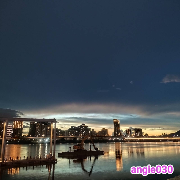 紫燈的拱橋有著浪漫的氛圍 天際裡的分界線是藍灰 依河而建的高樓大廈燈火閃耀搭配 訴說著晝夜互推分秒必追 聽風輕輕吹,雲兒擺動飛 天空浮現漸層線條之美 想像著飛碟穿越雲海歸 萬家燈火排列閃耀齊卡位 閃爍迷人的夜晚讓人沉醉 今晚的夜來杯美酒加咖啡 沉浸在這美好的氛圍 舉起杯,乾杯 angie030 1140720