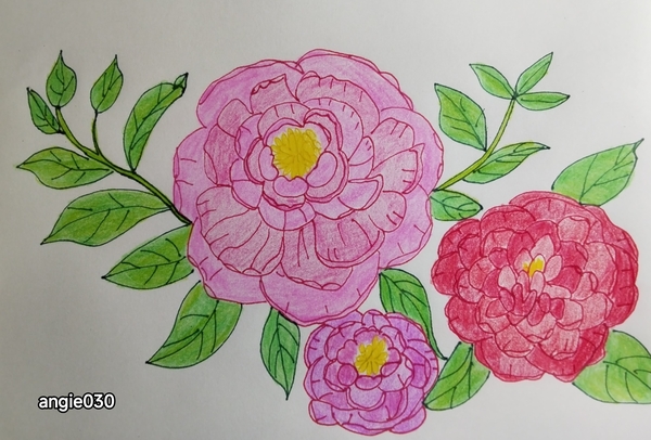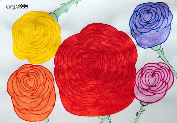 愛心花朵見綻放,依序刻畫齊歌唱,玫瑰嬌豔刺女郎。