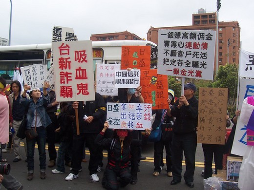 各位好朋友: 我們預定在5/8日遊行(中午12:00整在台北火車站南二門集合), 遊行完後再至主管陳沖家抗議, 我們可能會安排專車(大巴士)自立法院載大家至目的地,然後於21:00後再將大家載回火車站解散 這是我們第一次: 1.台灣與香港二地同步為連動債因政府與銀行遲遲不作為的抗議活動 2.首度將抗議活動延續至晚間