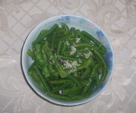 材料: 豇豆一把約半斤 大蒜2瓣 鹽,白醋,香油適量 作法: 1準備開水半鍋置冷凍庫冰涼備用。 2豇豆洗淨去除頭尾,折成約5公分長。 3大蒜去除外膜後切成細末備用。 4煮沸一鍋清水放入豇豆汆燙2分,撈起,置入巳冰凍之冷開水中浸泡, 迅速降温以保持豇豆翠綠的顏色。 5撈起瀝乾,加入鹽及蒜末略拌。 6再加入白醋後攪拌均勻,靜置約三十分鐘。 7食用時淋上香油,即成一道清爽可口的佳肴。 |
