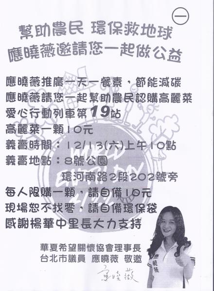 103.12.13am10-12高麗菜一顆10元,愛心活動到華江(售完為止)。