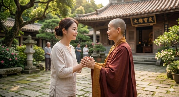 由於一日遊的行程裡臨時加進某寺院參訪,走進寺院的那一刻感到一絲熟悉,想起這裡是昔日一位好友出家的地方,那位曾經一起在蓮社共修多年的鄰居。 依著指引來到大殿,遠遠望見一位比丘尼,那外表與神情讓我立刻認出她。只是歲月為她添上一層風霜,如同覆上一層面紗,只能從依稀的神韻中尋找過往的影子。想來她看我也應如此。 我們對這場意外的重逢都感到歡喜,當年聽聞她出家,心中有許多疑問,究竟是如何的決心讓他捨下老公孩子?......然而當她一身袈裟站在面前,那些問題忽然變得不再重要,時間早已替她給出答案。 她說,出家近二十年,已經完全融入僧團生活,也很少回到俗家,即使回去也常見不到人,因為「黃醫師常會去找朋友。」她這樣形容時,我先是愣了一下,才明白那是她對昔日丈夫的稱呼。不再是親密熟悉的名字,而是一種社會上的角色名稱,語氣平靜無波。 這樣的轉變勝過任何解釋,過去的關係並未消失,而是被安放在一個較遠的位置,不再牽動內心。出家的生活單純而規律,牽掛自然減少;反觀俗世的繁複,對她而言也許已顯得喧鬧甚至疲累。 佛教常說,家人出家是難得的因緣,應以成就之心看待而非阻撓,然後「割愛辭親」,這其實就是一種更深的成全。近日讀到一則故事:蓮池大師剛出家時仍常回家探望妻子,其妻亦是具足智慧之人,深知丈夫若放不下情愛,修行終難成就。於是在門前設下火坑。當他再度返家走進庭院一邁步便跌入火坑,驚呼道:「你為何在此弄個火坑呢?」妻子平靜回應:「知道是火坑,為何還要回來?」就這一句話出家人當下頓悟,自此不再回頭,精進修行。這一故事道出了「三界如火宅」的真義。 與她的相遇不是刻意的拜訪,更像被時間召回的一次照面。兩條早已分岔的道路在此短暫交會,又各自延伸,今後不再續舊情,切磋的是佛法。我們最大的改變不在容貌,而在所處的世界;她有自己的身分、作息與戒律,我仍在紅塵之中生活,許多話題不再重疊。然而,我感到欣喜,能在此刻再續法緣,更加堅定自己讀經學法的決心,善緣善知識會是前行的助緣。臨別前我向師父恭敬合十,這次重逢是鼓勵也是鞭策。 |