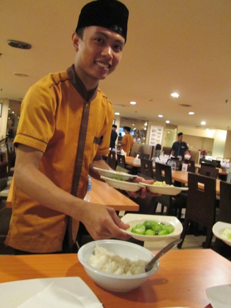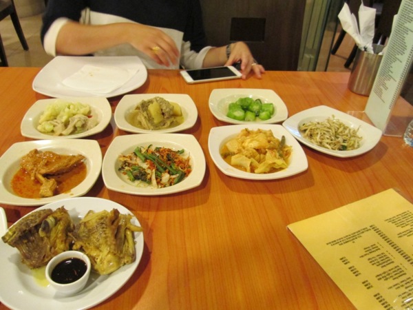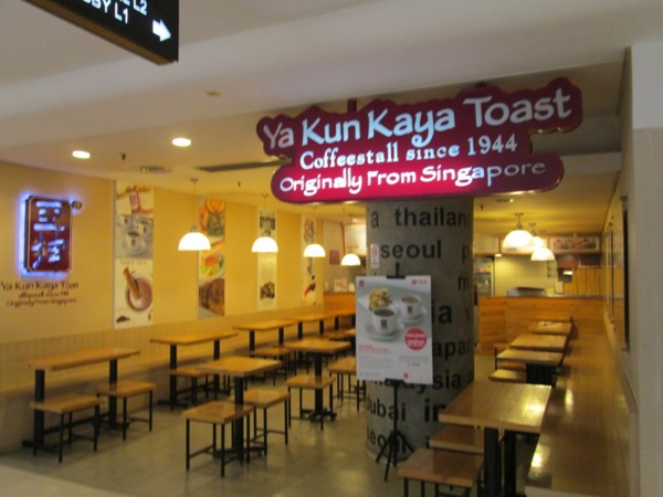 圖片說明:身著沙龍長裙的是我們隔壁攤位的先生。他們攤位上,產品就是6條攤平的絲巾。是我看過最酷的參展商。 圖片說明:賣PADANG (巴東菜)的店。是之前認識的廠商介紹我們,可去嘗試PADANG。 圖片說明:PADANG(巴東菜)很有趣。就座後,就會有小哥把所有菜都神乎其技的放在自已手上,再端到我們面前讓我們挑選。 圖片說明:最後我們挑了這些。右上角看起來像絲瓜的蔬菜,還頗好吃。 圖片說明:新加玻知名飲食品牌。好像是翻成"亞坤"。 圖片說明:新加玻知名的伽椰土司與奶茶。 開展當天,早早起床梳洗、吃早餐、去飯店附設健身房的跑步機上快走一下,再回房間換上今日衣物,做好萬全準備,前往展場。抵達時,令人感到欣慰的發現,昨天還敲敲打打,似乎離完工還有十萬八千里的展場空間,今日竟神奇的各就各位,還真的有了商機無限的展場樣子了呢。