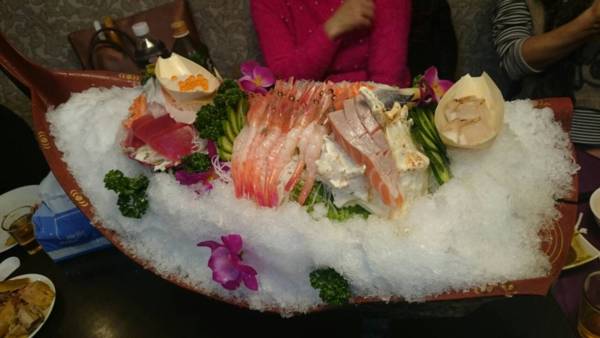 圖片說明:過了沒多久,很有口福的受邀參加朋友公司的尾牙,然後有幸見到名滿台北的"小李子海鮮"以及每桌必有的那艘龍船。真是好驚人吶!
