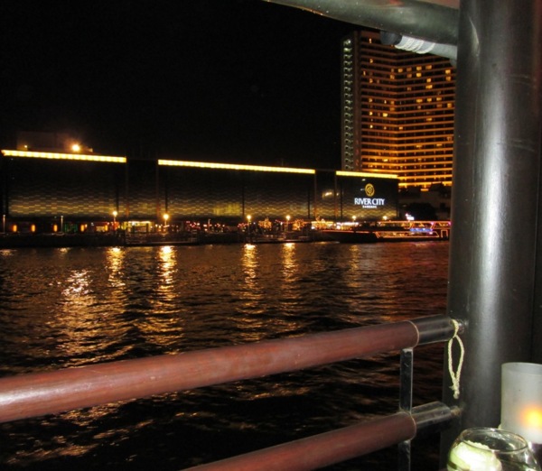 圖片說明:開胃菜與湯品。 圖片說明:甜點與水果類。 圖片說明:應是泰國小零食。但右前方褐色的小零食,不知道為何很甜,而且嚼起來很像橡皮筋....。 圖片說明:柚木船上,飲料都要另點,就算是水也是要錢。而本杯可樂要價泰幣180元,特拍照留念。 圖片說明:就歐美中年男仕+泰國型男組。 圖片說明:我座位前方,年逾50歲的情侶。此時是接吻累了的中場休息時分。 圖片說明:船快要靠岸時,由河面看向RIVER CITY百貨公司。 坐上飯店的接駁車到碼頭約莫30分。而環顧本車,清一色的西方臉孔,讓我放心多了。本船上晚餐收費昂貴,飯店又是純英文的密密麻麻頁面,依我研判應該不會碰到鐵幕國家子民才對。 其實跟西方遊客同桌同車同船有個缺點,就是我們應該要小小煩惱會不會碰到看不爽西方臉孔就來個恐怖攻擊之類的事——但在我的心裡,鐵幕國家的人事物比恐怖攻擊還恐怖千百倍。人的快樂是比較級,煩惱也是,如果這樣比起來,我寧可跟西方遊客待在一起,因為恐怖攻擊又沒有鐵幕國家可怕啊。 飯店經理JIMMY領著我們車上一行人下車,進了RIVER CITY百貨公司。建在昭披耶河旁的RIVER CITY百貨公司,戶外即是各式遊船出返航的碼頭;金黃色的燈光打上去,襯著夜晚黝黑的河面,夜色下像極了一座宮殿。8點一到,我們就登船了,開始今晚的Apsara Dining Cruise船上晚餐。