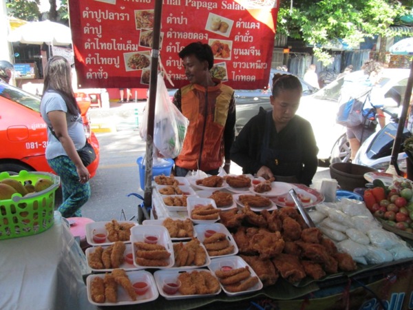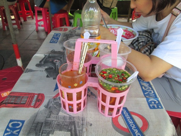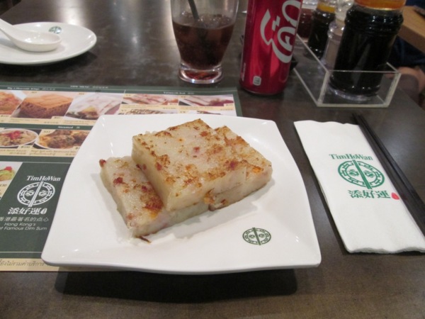 圖片說明:恰圖恰市集外圍的小吃攤。雞腿不錯吃,但一隻要價70元。 圖片說明:正在吃米粉湯的麗華。桌上的調味料也很有趣,還是有白糖。 圖片說明:向來熱愛港式飲茶的我,在TERMINAL 21百貨裡發現"添好運",當然義無反顧的進去光顧了。蘿蔔糕很好吃! 圖片說明:燒烤豬頸肉似乎在泰式料理上的菜單上都看得到。這盤是在我們停留的RED PLANET飯店外的小吃攤點的。