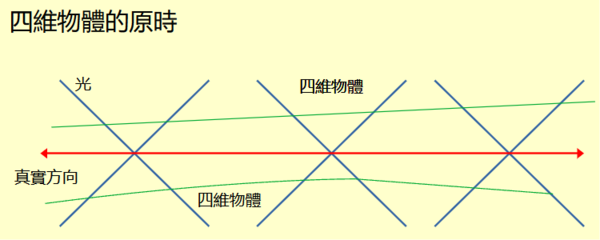 四維距離是連結兩點之間直線線段的長度。當直線與真實方向的夾角小於45度,直線線段的長度是線段的原時。進一步推論。如果一條線段,不必是直線,中每一點的切線與真實方向的夾角都小於45度,線段的長度是線段的原時。 那三維空間度量是不是與真實方向夾角超過45度的線段呢?不盡然。後續會詳細說明。 |