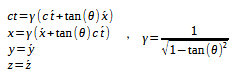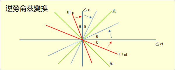 首先要找到乙通過原點的垂直三維空間。在前面「真實宇宙如何經觀察生成相對論」中,觀察者用光鐘測量時間導致閔考斯基度量。乙的光鐘其中一個鏡子C放在原點,另一個D放在y軸的方向1光秒的距離。兩個鏡子都在乙通過原點的垂直三維空間。如果鏡子D放在甲的x軸方向呢? 鏡子D的四維路徑必須與乙的四維路徑平行,也就是向甲的x軸方向傾斜θ角的直線。但是與原點的距離應該多少呢?如果D放在甲的x軸方向1光秒的距離,座標(0,1,0,0)的位置,光經過反射到達C鏡子的位置是( 原因是(0,1,0,0)並不在乙通過原點的垂直三維空間中。D鏡子只有在乙的三維空間中距離才是1光秒。四維距離是i1光秒。由此可以得到D在乙原點的垂直三維空間座標( 乙的ct軸在距離1光秒的位置是( 這樣可以得出勞侖茲變換 與逆勞侖茲變換