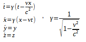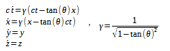 勞侖茲變換指的是狹義相對論中物理量由一個慣性參考系變換至另一個慣性參考系的變換公式。讓變換前的參考系為甲,變換後的參考系為乙。乙向甲的x軸方向以v的速度前進。發生在甲的一個事件的座標(t,x,y,z),變換到乙的座標是(t`,x`,y`,z`)。那麼兩個座標的關係是 這套變換公式雖然沒有錯,然而勞侖茲建立這套公式時並不理解閔考斯基空間。以至於對於公式的理解流於表面。 從閔考斯基空間來理解勞侖茲變換,勞侖茲變換本質上是從一個笛卡兒座標系變換到另一個笛卡兒座標系。而且是一個有限制的變換。 一般座標系變換可以變換原點。勞侖茲變換沒有變換原點。一般座標系變換座標系的軸方向沒有限制。由於光的方向與時間軸的夾角是45度,勞侖茲變換時間軸之間的夾角必須小於45度。 要深入理解勞侖茲變換,考慮參考系甲。甲的四維路徑與真實方向重疊。甲的座標系是標準座標系。參考系乙的四維路徑是通過原點,向甲的x軸方向傾斜夾角θ的直線。θ小於45度。如何從甲變換至乙的座標系呢?