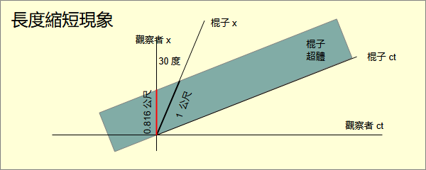 相對論從提出到現在已經超過100年。當愛因斯坦提出相對論時物理界對時空的理解尚停留在力學的會隨時間變化的三維空間的觀念上。以至於除了閔考斯基,其他的物理學者對於相對論中推導出的許多現象的理解是錯的。這些錯誤流傳到今天仍然在書籍裡、課堂中繼續誤導學生。長度收縮(length contraction)的觀念就是其中之一。 在相對論的解說中,通常會提到長度收縮這個觀念。簡單的說,就是當一個物體與觀察者有相對速度,物體的長度會變短。這個現象稱為長度收縮。 長度收縮這個觀念最早是由費茲傑羅(George Francis FitzGerald)與勞崙茲(Hendrik Lorentz)提出來解釋邁克生-莫雷(Michelson-Morley)實驗結果所提出的解釋。基本觀念是運動中的物體沿運動方向的長度會收縮。收縮後的長度是原長/勞崙茲因子。其中原長(proper length)是物體靜止時的長度。而勞崙茲因子是 從邁克生-莫雷實驗結果證明長度收縮所描述的現象確實存在。問題是物體長度為什麼會收縮?是物體長度真的收縮?還是因為人類觀察的干擾而收縮?還是人類的錯覺?還是什麼其他原因? 事實在勞崙茲提出長度收縮之前,黑維塞(Oliver Heaviside)推導出靜電場會因速度而從球形變成橢球形。速度是相對速度。不同的相對速度,橢球形狀不同。因此靜電場的形狀與相對速度相關。形狀是相對的。 為了解釋這個現象,勞崙茲認為構成物體的原子之間的距離縮短。 在愛因斯坦提出相對論之後,愛因斯坦提出的解釋是由於閔考斯基度量,以勞崙茲變換可以證明長度會因相對速度而收縮。 所謂長度收縮所描述的長度縮短現象確實存在。但是我認為這個現象不應該理解為長度收縮。也就是說,長度收縮這個觀念是錯的。 以一個簡單的比喻來說。有一塊長方形的木板。寬度1公尺。有一個人拿尺量木板的寬度。但是沒有與寬邊平行測量。而是與寬邊傾斜30度測量。測出的值是1.154公尺。於是這個人宣稱發現了「寬度伸長」現象與規律。測量的值的確變大了,但是木板的寬度其實並沒有伸長。其他人只會認為這個人測量斜了。而且當物體不是長方形,就不符合「寬度伸長」的規律。 長度縮短以閔考斯基空間來理解就變得很簡單。有一個慣性觀察者甲及一根長1公尺的棍子。棍子的四維路徑向甲的x軸方向傾斜30度。對甲而言,棍子的長度不是1公尺,而是0.816公尺。為什麼? 在「四維空間中人類如何觀察物體」中說過,人類觀察物體的長度是四維超體在觀察者垂直三維空間切體的長度。然而只有物體四維路徑的垂直三維空間切體長度才是物體的真正長度,稱為原長(proper length)。當物體的四維路徑與觀察者的四維路徑存在夾角,也就是斜了,觀察者的三維垂直空間與物體的三維垂直空間也斜了。測量的長度自然不是原長。所以長度變短現象的真正原因是量斜了,而不是什麼特殊的長度收縮。 為什麼量斜了會變短而不是變長呢?這是因為閔考斯基度量中的相減而不是歐幾米得度量的相加所導致的差異。 |