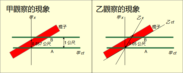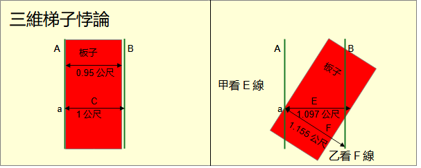 在二十世紀初,愛因斯坦剛提出相對論不久,物理界仍然對相對論將信將疑,仍然以傳統力學的時空觀念看待相對論,遂產生了許多所謂的悖論。其實這些所謂的悖論只是出於對相對論的誤解,並不是真正的悖論。其中就有梯子悖論(ladder paradox),也稱為竿與穀倉悖論(barn-pole paradox)。 這個悖論依據維基百科的敘述: 有一個梯子和一個有前門與後門的穀倉。梯子的長度比穀倉前、後門間的靜止長度要長。如果梯子不移動的話,其是無法容納進整個穀倉裡的。 此時如果有一個人,拿著這個梯子,以接近光速的速度,向穀倉運動的話。對於站在穀倉,一名靜止旁觀者而言,因為收縮效應,當梯子高速移動經過穀倉時,可以完美地容納進穀倉。也就是說,對於這名旁觀者而言,梯子的長度小於穀倉前、後門間的長度。 但是另一方面,對於拿著梯子的人而言,由於與梯子沒有相對速度,因此梯子並不會縮短。反而是觀察到穀倉以接近光速的速度向自己移動,因為收縮效應,穀倉會收縮。也就是說,對於拿著梯子的人而言,梯子的長度大於穀倉前、後門間的長度。 梯子怎麼可能又長於穀倉,同時又短於穀倉? 梯子悖論是一個偽悖論。維基百科的解釋是在相對論中對於每位觀察者「同時性」是相對的。這個解釋是錯的。相對與同時的意義互相矛盾。同時就不可能相對,相對就不可能同時。在相對論出現的初期,物理學界仍然以力學的三維空間看待相對論。將許多舊的觀念錯誤地直接沿用到相對論。相對論根本沒有「同時」這個觀念。也就是說,現象可以存在,但是問題錯了。那應該怎麼理解這個現象呢? 這個悖論是以時間為參數的三維空間敘述。而相對論的宇宙是四維的閔考斯基空間。要理解這個悖論得改換成以閔考斯基空間敘述。 這個悖論的敘述即使在三維空間也過於複雜,再換成四維空間之前,先簡化到最基本的三維論述。 地上相距1公尺畫A、B兩個點。一條直線連接兩點。一根極細長1.05公尺的棍子。將棍子沿著直線以0.577光速移動。地上靜止的觀察者甲在某一個時刻看到棍子夾在兩點之間。而隨棍移動的觀察者乙從沒有看到這一現象。 再以四維重新敘述一遍。 在真實宇宙中並不分時間、空間,而是渾然一體。是人類以計時器測量時間,以尺測量空間而分成時間與空間。每一個人,推及到每一個物體,以自己為參考系測量時間與空間,因此有自己的時間與空間。由於光與真實方向在任何一點的夾角都是45度,加上測量方法相同,每一個人測量出的時空度量都是閔考斯基度量。同在地球上的人,測量的時間雖然不同,但是差異極小。 物體在四維空間是四維超體,有時、長、寬、高四維長度。由於1秒等於1光秒的長度,任何物體都是細長的一條線。這條線是物體的四維路徑。路徑的長度是物體的原時。 物體在任何一個時刻都有一個垂直於四維路徑的三維空間。物體在自己的垂直三維空間的切體的長、寬、高是物體在該時刻的原長、原寬、原高。 人類觀察者本身也是四維超體。人在一時刻觀察到的三維形體是物體在人的垂直三維空間的切體。當物體的四維路徑與人的四維路徑的夾角等於0度,人的垂直三維空間與物體的垂直三維空間完全重合。人看到物體的度量是物體的原長、原寬、原高。 當物體的四維路徑與人的四維路徑的夾角不等於0度,人觀察到物體在移動。速度是tan(夾角)。人的垂直三維空間與物體的垂直三維空間不一樣。人看到物體的度量是物體的斜長、斜寬、斜高。 為了敘述方便,建一個ct-x的座標系。地上A、B兩點成為與ct軸平行,沿x軸相距1公尺的A、B兩條線。棍子成為與ct軸平行,沿x軸長度1.05公尺板子。將板子向x軸旋轉。超過某一個角度後與ct軸平行的觀察者甲看到在某一時刻板子的三維切體,也就是棍子,落在兩點之間。而與板子平行的觀察者乙在任何時刻都只看到棍子至少有一段落在兩點之外。 在「長度其實沒有收縮」中已經說明,所謂長度收縮其實只是在閔考斯基空間中斜長小於原長的現象。斜度越大,棍子對於甲的斜長越小。當夾角到30度,板子斜長是0.857公尺,自然能落在兩線之間。在乙的任何時刻,三維空間都與板子的三維空間重合。看到的是板子的原長。當然至少有一段落在兩點之外。 所以梯子悖論現象的根本原因是兩個觀察者由於四維位置與方向不同,測量的是兩條不同的線段。 其實在三維歐幾米得空間有對應這個悖論的現象。 在地上畫A、B兩條極長相距1公尺的平行線。A線在左,B線在右。一塊極長寬0.95公尺的板子。將板子左邊沿A線放入兩條線之間。板子可以完全放入。任何觀察者沿著任何橫過板子的線看到的都是板子在兩線之間。 在A線任選一點a畫一條垂直線C到B線。C線長1公尺。在板子靠a點劃一條垂直線D直到右邊。D線長0.95公尺。D線與C線重疊。 在板子靠a點順時針方向旋轉30度。在板子左邊靠a點沿著C線畫一條直線E到板子另一邊。E線的長度是1.097公尺。一個沿著E線的觀察者甲看到板子突出B線。 從A線的a點沿著D線畫一條直線F到B線。F線的長度是1.155公尺。沿著F線的觀察者乙看到板子仍然在兩線之間。 板子的寬度怎麼可能同時既大於兩線之間的距離,又小於兩線的距離? 在隨時間變化的三維空間中可是有「同時」的,但是無助於回答這個問題。實際上沒有人會認為這是悖論。E線與F線,根本是兩條不同的線。自然長度