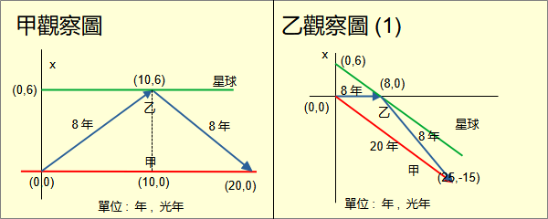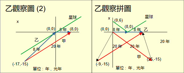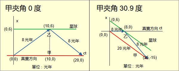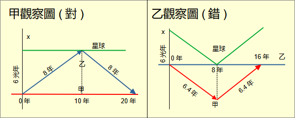狹義相對論有三種。 第一種是愛因斯坦相對論,建立在光速對慣性參考系不變及物理定律的相對性上。 第二種是閔考斯基相對論,建立在閔考斯基空間上。 第三種是真實相對論,建立在宇宙中任何光與真實方向的夾角均為45度上。 這三種相對論的關係是:從真實相對論經過人類觀察可以推導出閔考斯基相對論。從閔考斯基相對論可以推導出愛因斯坦相對論。因此三者中的物理定律完全相同,差別在對於物理意義的理解不同。從孿生子悖論的理解可以比較三者的差異。 孿生子悖論的敘述很簡單: 有一對孿生子。一個待在原地。另一個以高速去一個遙遠的星球,然後回到原地。回到原地後,旅行的發現自己比留在原地的年輕。在相對論中每一個觀察者都處在平等地位。按照相對性,留在原地的發現自己比旅行的年輕。 上面的敘述與其他相對論悖論一樣,不夠嚴謹,難以當作論證的基礎。 將留在原地的孿生子稱為甲,旅行的稱為乙。相對論要求甲必須是慣性觀察者。由於甲自己是參考系,甲必須是真實慣性。 甲符合真實慣性。乙呢?乙必須出去轉一圈再回來。乙不可能是真實慣性,必然有加速。不符合愛因斯坦的光速不變的要求。光速對乙會變。 先討論愛因斯坦相對論。為了討論方便,將孿生子悖論落實到一些數據。設定星球離原地的距離為6光年。相對於甲,乙以0.6光速航向星球。到達星球後沒有停留,立刻再以相同的速度返回原地。 從甲看來,6光年/0.6光速=10年。乙需要花10年時間才能到達星球。然後再花10年從星球回來。一共20年。甲增加了20歲。乙的時間可以用時間膨脹(time dilation)計算。時間膨脹率是0.8。乙去星球花了8年,回來花了8年。一共16年。乙增加了16歲。 從乙看來,星球以0.6光速向自己飛來。長度收縮(length contraction)率是0.8。距離是4.8光年。4.8光年/0.6光速=8年。來回一共16光年。乙增加了16歲。在前8年乙看甲以0.6光速離去。經過時間膨脹換算,甲經過6.4年。在後8年乙看甲以0.6光速返回。經過時間膨脹換算,甲也經過6.4年。一共12.8年。甲增加了12.8歲。20歲與12.8歲,哪個是對的? 這裡很容易看出乙不是慣性參考系。因此計算時間必然是錯的。當時許多學者認為是加速度造成錯誤。卻不知道加速度如何造成錯誤。 從上面的乙觀察圖可以看出,乙的時間軸是由0至8年和8至16年兩段所組成。這兩段原本方向不同,所以必須是兩個座標系。0至8年是一個座標系。然後接上8至16年的另一個座標系。將座標系這樣相接在數學上是錯的。所以錯誤來自於方向的改變導致錯誤地嫁接座標系。 很顯然的,三維空間思維導致這些困擾。相對論需要四維空間才能真正理解。時間膨脹、長度收縮都是錯誤的觀念。愛因斯坦本人之後也採用了四維空間。但是初始的這些錯誤觀念仍然流傳至今,存在於一些相對論的書籍、網路、教學,繼續誤導學生與大眾。 再從閔考斯基相對論來看孿生子悖論。閔考斯基相對論建立在閔考斯基空間(Minkowski space)上。閔考斯基空間是具有閔考斯基度量(Minkowski metrics)的四維空間。閔考斯基度量並不是閔考斯基提出的;是愛因斯坦在他的相對論論文中推導出來的。愛因斯坦將論文交給閔考斯基審閱。閔考斯基敏銳地看出相對論的空間應該是具有愛因斯坦度量的四維空間。然而後世將這個度量稱為閔考斯基度量。 光速不變可以推導出閔考斯基度量;閔考斯基度量也可以推導出光速不變。雖然在出現順序上光速不變在先,似乎在物理觀念上閔考斯基度量更為基本,是麼? 解開孿生子悖論的關鍵在於計算出甲與乙的原時(proper time)。原時是閔考斯基提出的觀念,指的是物體自身經歷的時間長短。這個值顯然不會隨著參考系變化。甲與乙誰的原時長誰的年紀就比較大。無論是什麼座標系,原時就是沿著物體的四維路徑以閔考斯基度量計算路徑的長度。 在相對論中每一個觀察者都可以當參考系。以甲為參考系建立一個笛卡兒座標系。時間單位是年;空間單位是光年。甲乙分離點為原點。甲的四維路徑為時間軸t。星球方向為x軸。星球四維路徑是(t,6光年,0,0)的直線。 乙的四維路徑是分成兩段的折線。前一段是與時間軸向x軸方向傾斜30.9度的直線直至與星球相交於(10年,6光年,0,0)。以閔考斯基度量算出線段長度是8光年。後一段是從(10年,6光年,0,0)開始,向-x軸方向傾斜與時間軸夾角30.9度的直線直至與時間軸相交於(20年,0,0,0)。長度也是8光年。據此可以得出甲從相離到重聚的原時是20年。乙是16年。 再看以乙為參考系的情形。由於乙的四維路徑是折線,以乙為參考系得分別為前段與後段各建立一個笛卡兒座標系。乙前段的座標系實際上是甲的座標系經過勞崙茲變換。相離位置仍是(0,0,0,0);乙抵達星球位置是(8,0,0,0);相聚位置變成(25,-15,0,0)。乙的原時仍然是16年;甲的原時仍然是20年。 乙後段的座標系實際上是甲的座標系先移到(10,6,0,0),再經過勞崙茲變換。相離位置變成是(-17,-15,0,0);乙抵達星球位置是(0,0,0,0);相聚位置變成(8,0,0,0)。乙的原時還是16年;甲的原時還是20年。 如果將乙的前後兩段拼成一張圖,與前面乙觀察圖(錯)相對比,就清楚看出兩者的差異。從而得知以三維空間理解相對論為什麼會錯。 真實相對論是立基於宇宙在人類觀察前的物體與光的狀態與行為。宇宙本身是一體的四維空間,並不分時間與空間。光與真實方向夾角45度。