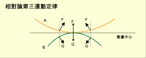 運動三定律是牛頓力學的基礎定律。在相對論中也有對應的三定律。在力學篇已經證明運動三定律來自於力學中的群體動量守恆律。而群體動量守恆律其實就是群體慣性定律。在相對論中有四維動量守恆律。而四維動量守恆律也是四維群體慣性定律。力學與相對論的差異僅在於度量。所以運動三定律如同動量守恆律也是超越度量的觀念。 在真實宇宙中,每一個物體的四維路徑都是一條線。在沒有受到外力影響的情況下,物體的線是直線。在有外力的情況線,是曲線。 曲線任何一點的彎曲程度稱為曲率。曲率的觀念是向切線對於路徑的變化率。向切線只是方向,沒有數值。一種方法是衡量方向角度的變化率為曲度。這裡採用的是由讓·弗雷德里克·弗勒內(Jean Frederic Frenet)和約瑟夫·阿爾弗雷德·塞雷(Joseph-Alfred Serret)分別提出的方法,稱為弗勒內-塞雷(Frenet-Serret)公式。 弗勒內-塞雷的方法是建構一個向量,稱為單位切向量(unit tangent vector)。向量的數值是1;方向是向切線。以這個向量對路徑微分。所得出的向量數值為曲度,方向為向法線。與這個定義適用於各種度量。 d單位切向量/d四維路徑 = 曲率 × 單位法向量 真實四維力也是不隨觀察者或參考系變化的固定量。相對四維力是真實四維力在觀察者的座標系的四個分量所組成。 由於真實四維動量的方向就是向切線的方向,如果質量不變,真實四維力與曲率及向法線的關係是: 真實四維力 = 質量 ×曲率 × 單位法向量 這個關係就是採用弗勒內-塞雷公式的原因。 下一步要探討相對論對應牛頓的第三運動定律:作用力與反作用力相等而方向相反。 首先要注意的是牛頓的力是三維空間的力,而相對論的力是四維力。除了在時間的分量為0,四維力是不可能方向完全相反。因此兩個四維力只能三維分量相反。 其次是牛頓的的作用力與反作用力同時發生。在相對論中沒有同時。怎麼辦?幸好除了同時之外,兩個力還屬於同一個三維空間。力學只有一個三維空間,而相對論有無數的三維空間。因此得找到既含有作用力也含有反作用力的三維空間。如何尋找呢?先從一個案例來看。 假設有A、B兩個球碰撞。兩個球的四維路徑經過碰撞自然不可能是直線。不是直線,必然受到力的作用。如何證明兩個球受到的力三維分量相等但是方向相反呢?必須A球路徑上每一個受作用力F的點在B球的路徑上都有一個對應受反作用力的點。假設A球路徑上a點受作用力F,如何找到B球路徑上對應的b點呢?幸好無論相對論或力學都有動量守恆律。在力學中可以用動量守恆律推導牛頓第三運動定律。在相對論中也可以用四維動量守恆律推導。 A球與B球可以看為一個群體,有群體動量中心。動量中心的路徑是一條直線。直線中必然有一點的垂直三維空間含有a點。這個點稱為c點。垂直三維空間必然與B球的路徑相交。交點是b點。那B球在b點所受的力G是不是就是反作用力?G的三維空間分量是不是與F的三維空間分量相等而方向相反? 依據動量中心的定義,在每一個垂直三維空間中,A的三維動量,也就是四維動量的空間分量,必須與B的三維動量互相抵消。因此在a點的三維動量與b點的三維動量互相抵消。由於碰撞,a點的三維動量與b點的三維動量都在變化。兩者的變化也必須互相抵消才能保持之後的三維動量互相抵消。然而兩者的變化率是對於動量中心的原時,不是各自的原時。原時之間依勞倫茲變換。所得的公式是: A勞倫茲因子-1 F空間分量 + B勞倫茲因子-1 G空間分量 = 0 其中四維空間的勞倫茲因子使用的不是速率,而是向切線的夾角。由於物體線是曲線,夾角不斷變化,勞倫茲因子跟著變化。公式中的勞倫茲因子是在a點和b點的勞倫茲因子。 依據動量中心的定義,兩球路徑的轉折點必然同在一個垂直三維空間。各自的四維動量與動量中心的四維路徑方向一致。勞倫茲因子為1。時間分量為0.作用力等於負作用力而方向相反。公式成為: F + G = 0 與牛頓第三運動定律完全一樣。 這就是相對論的運動三定律。 |